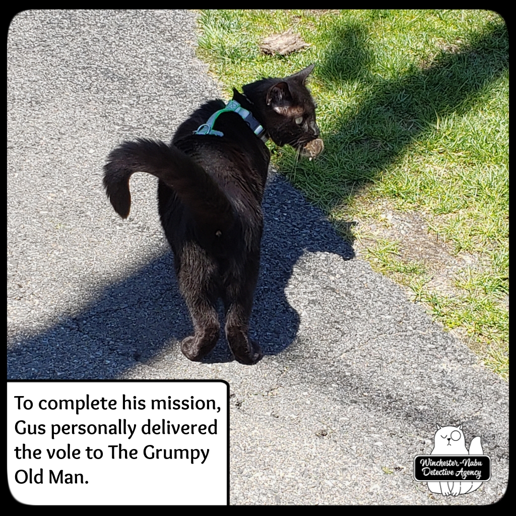 To complete his mission, Gus personally delivered the dead vole to The Grumpy Old Man. Gus in driveway with vole in his mouth.