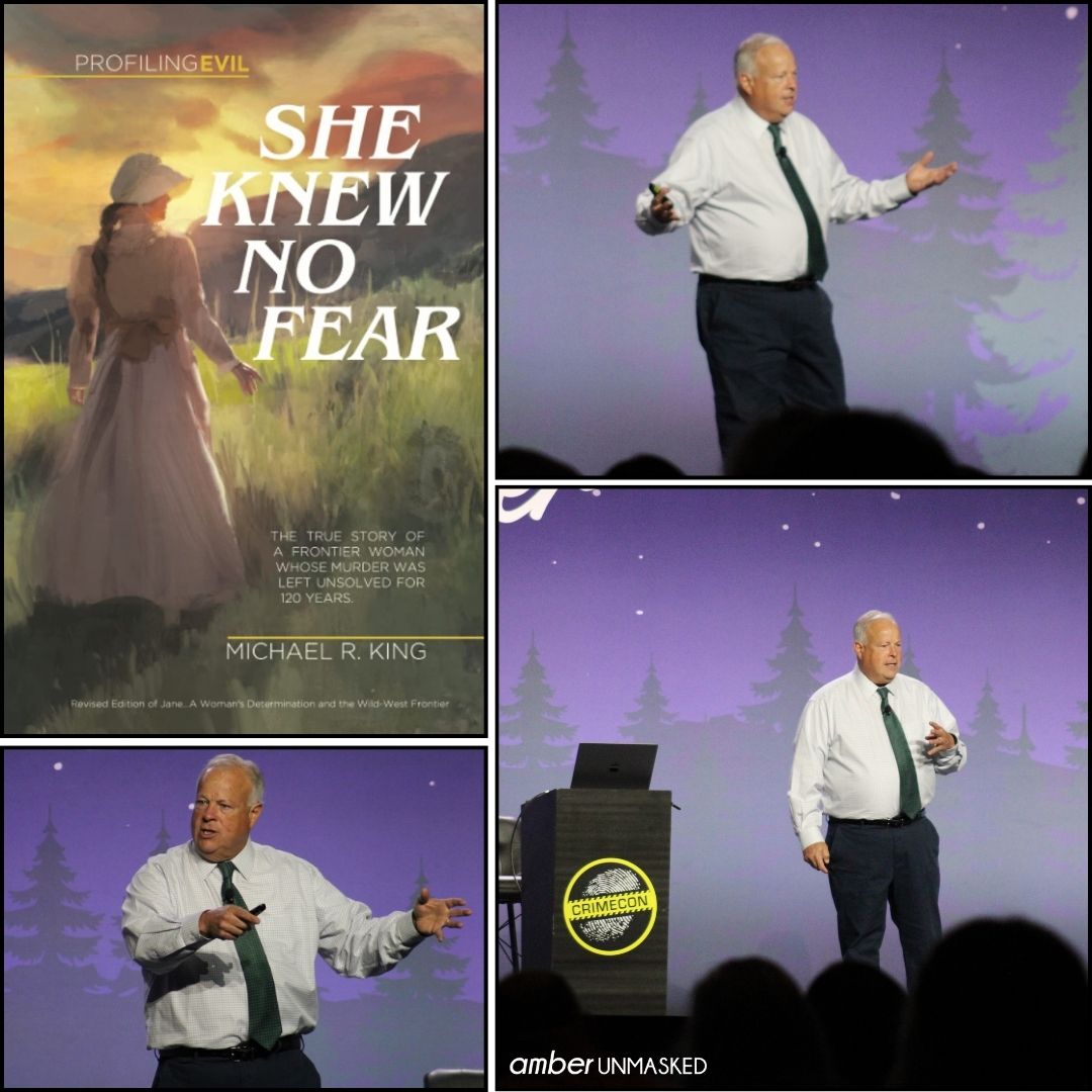 collage: "She Knew No Fear" book cover (a woman facing away in a historical prairie dress outside); Mike King on stage at CrimeCon talking about the LDS cults