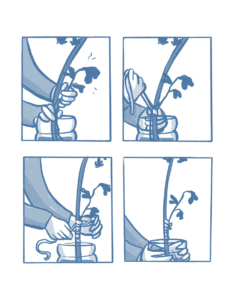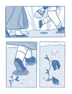 The mother grafts a small cutting from the wolves’ foliage to an existing plant she’s growing. This calls back the scene in book one about the girl pitting a magical rose in a vase.