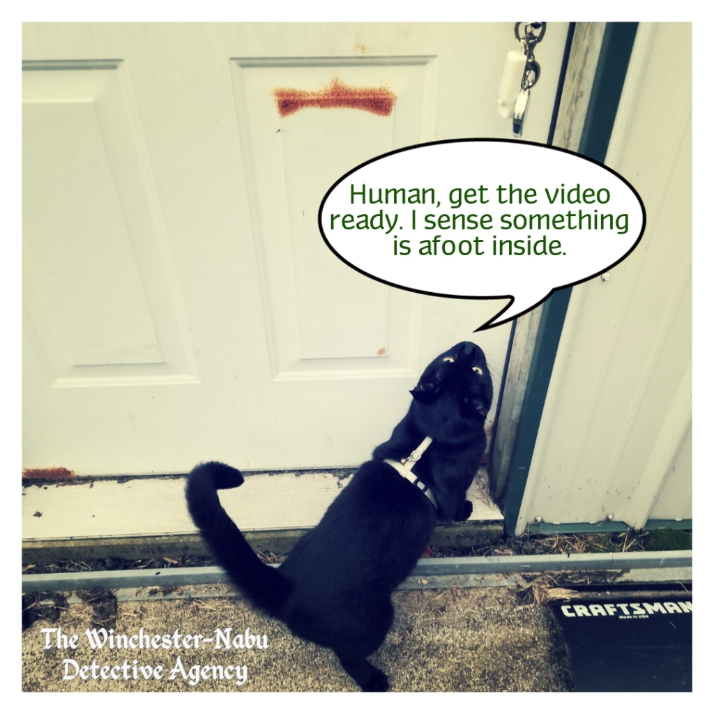 Gus at the back entrance to the garage and workshop: Human, get the video ready. I sense something is afoot inside.